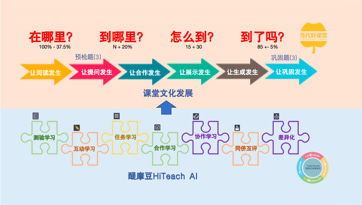 打造一堂好課的成功密碼:文化+技術。其中,文化需緊扣四大核心追問——“在哪里?”“到哪里?”“怎么到?”“到了嗎?”,依托六個發生:以“讓閱讀發生”激活思維,以“讓提問發生”深化探究,以“讓合作發生”促進社會性成長,以“讓展示發生”錘煉表達力,以“讓生成發生”推動創新遷移,以“讓鞏固發生”實現結構化沉淀。最后,利用HiTeach七大方法策略(包括測驗模塊、互動模塊、任務模塊、合作學習模塊、協作模塊、同儕互評和差異化等功能)實現技術賦能,確保教學過程的高效推進,讓學習真實發生,助力打造一堂高質量的好課。