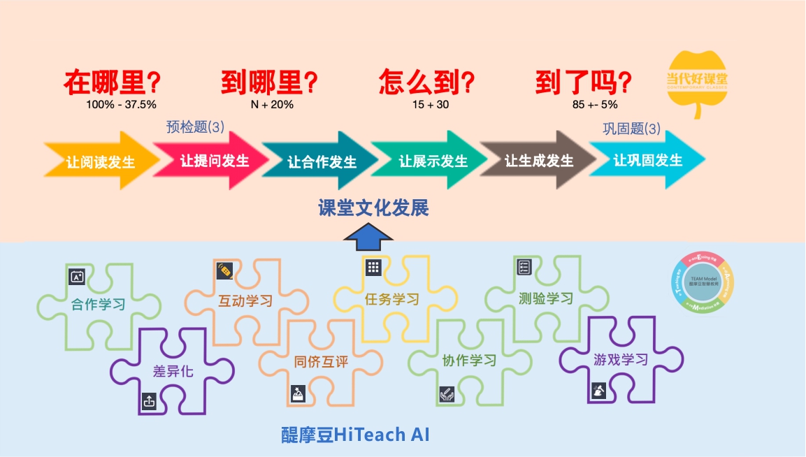 打造一堂好課的成功密碼:文化+技術。其中,文化需緊扣四大核心追問——“在哪里?”“到哪里?”“怎么到?”“到了嗎?”,依托六個發生:以“讓閱讀發生”激活思維,以“讓提問發生”深化探究,以“讓合作發生”促進社會性成長,以“讓展示發生”錘煉表達力,以“讓生成發生”推動創新遷移,以“讓鞏固發生”實現結構化沉淀。最后,利用HiTeach七大方法策略(包括測驗模塊、互動模塊、任務模塊、合作學習模塊、協作模塊、同儕互評和差異化等功能)實現技術賦能,確保教學過程的高效推進,讓學習真實發生,助力打造一堂高質量的好課。